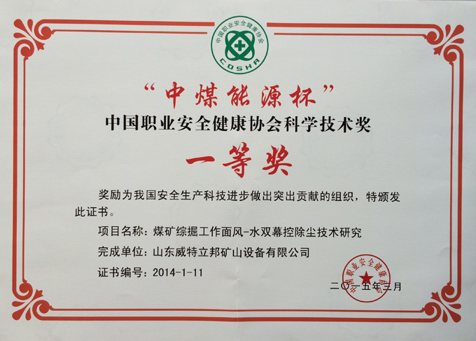 濟(jì)寧市首屆創(chuàng)新大賽“煤礦采掘面濕噴除塵系統(tǒng)設(shè)備”創(chuàng)新組二等獎(jiǎng)